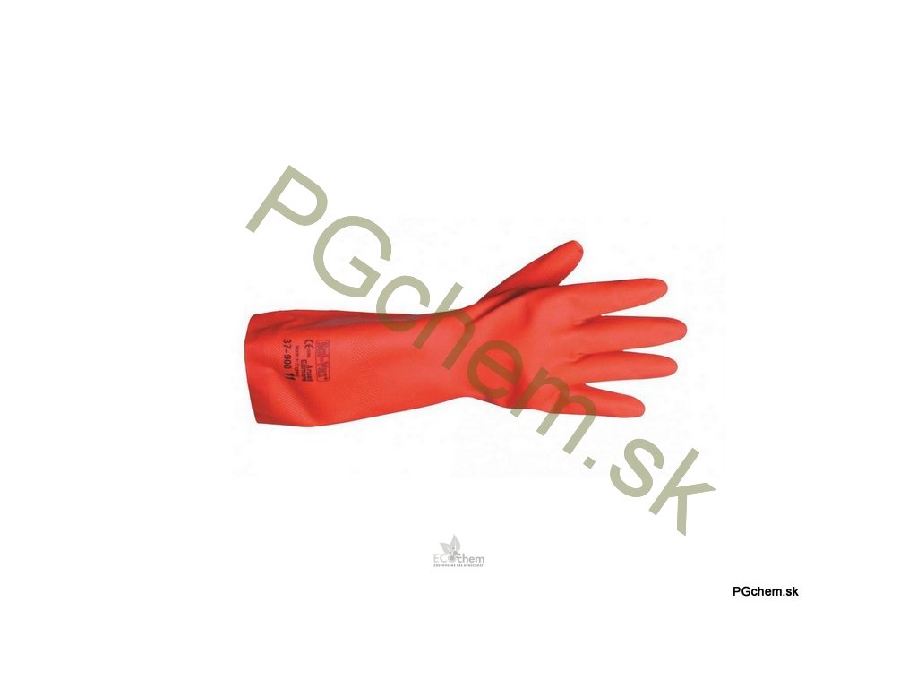 Červené rukavice z 0,425 mm silného nitrilu, s velúrovou úpravou vo vnútri, reliéfnym povrchom v dlani a na prstoch, v celkovej dĺžke 38 cm, individuálne testované na tesnosť.